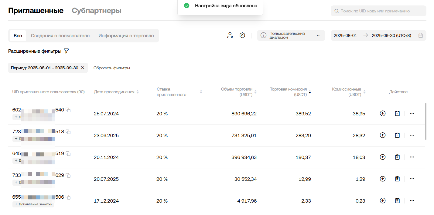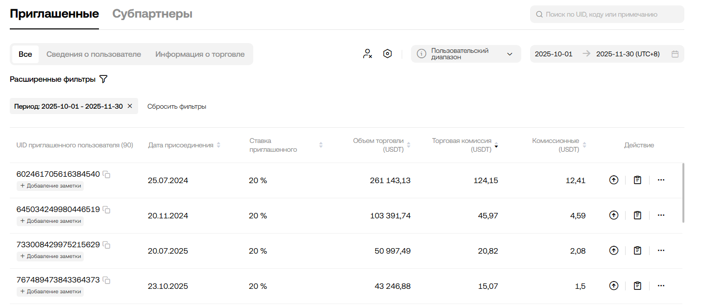 Как читать таблицу - пользователь 723....518 наторговал $731325 объема и заплатил за это $283 комиссий. Из которых УЖЕ вернул 20% - примерно $56.6 на аккаунт благодаря ставки приглашенного 20%.