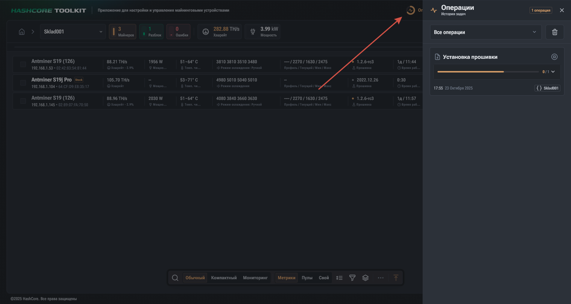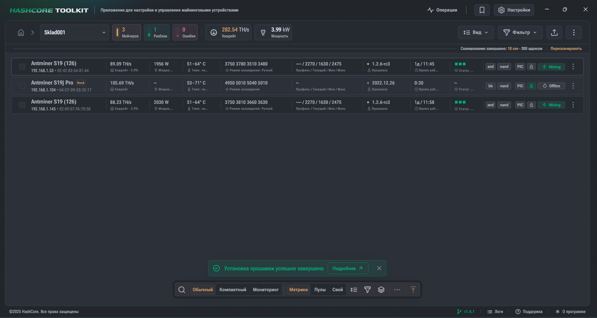 Группа сосканировалась, нашла 3 майнера, открываем группу: