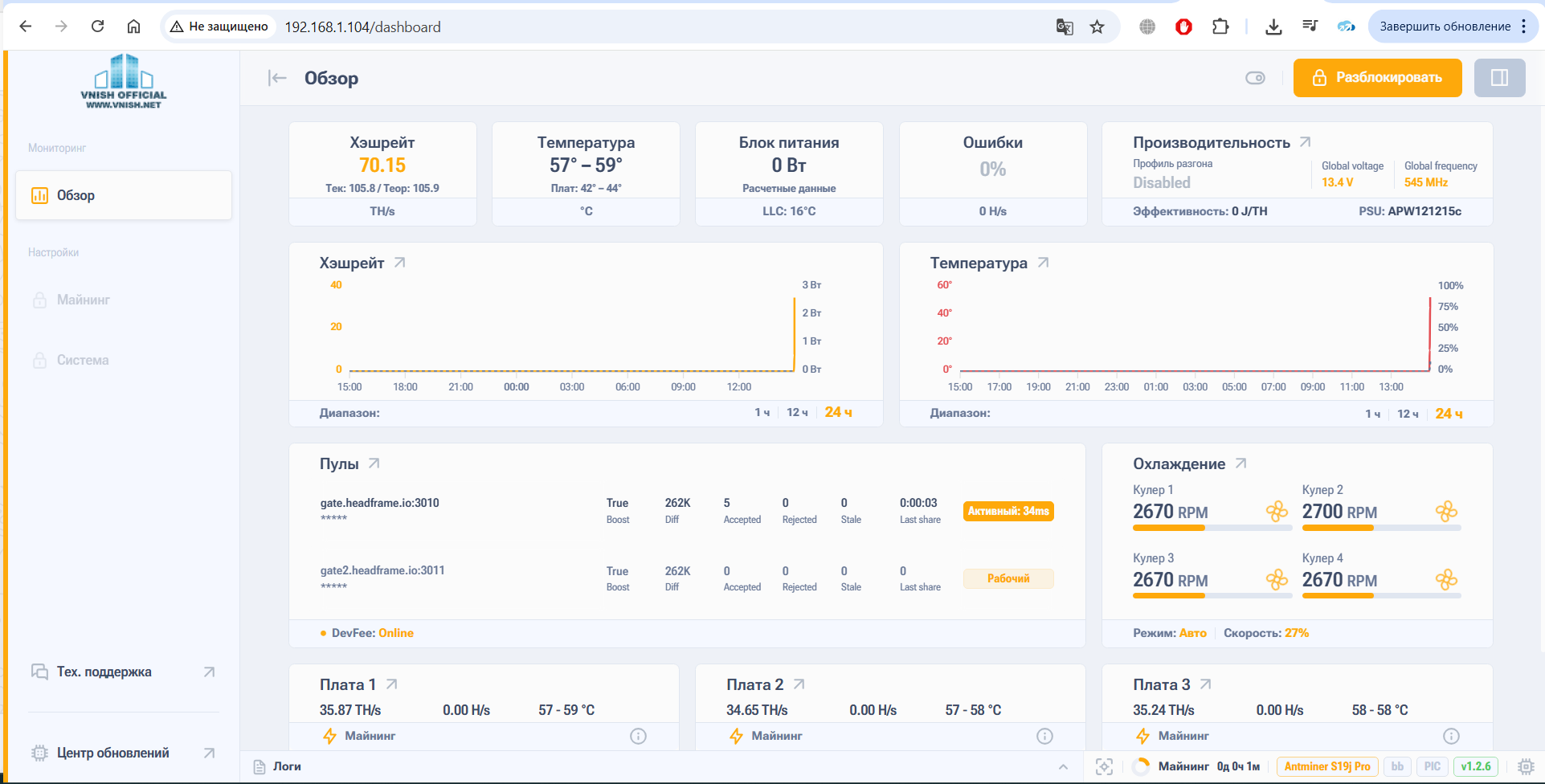 Прошика Vnish подойдет почти что для любых задач, важно лишь понять логику работы с Авто или Мануал вентиляторами и освоить динамическое переключение профилей майнинга.