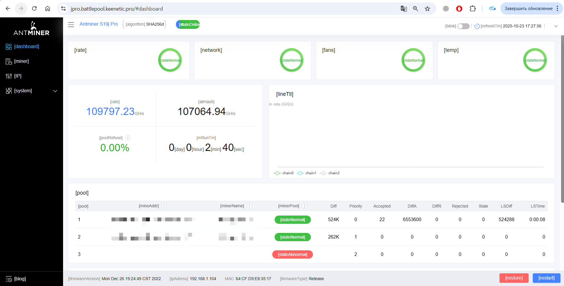 Закономерно, мой выбор пал на S19j pro 104T 126ch, как дешевый асик, зарекомендовавший себя достаточно надежным и гибким в настройке на прошивках Vnish.