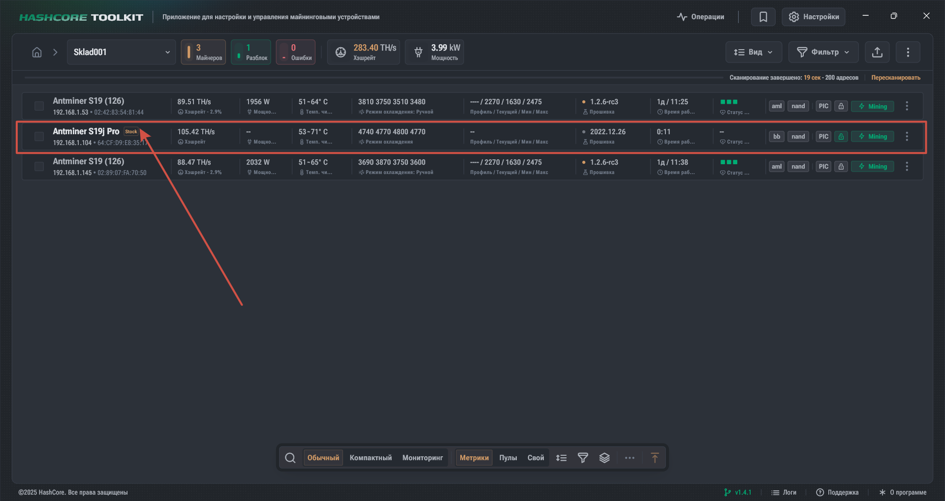 Видим, что у нас в сети есть S19j Pro со сток прошивкой. Наша задача - установить туда Vnish.