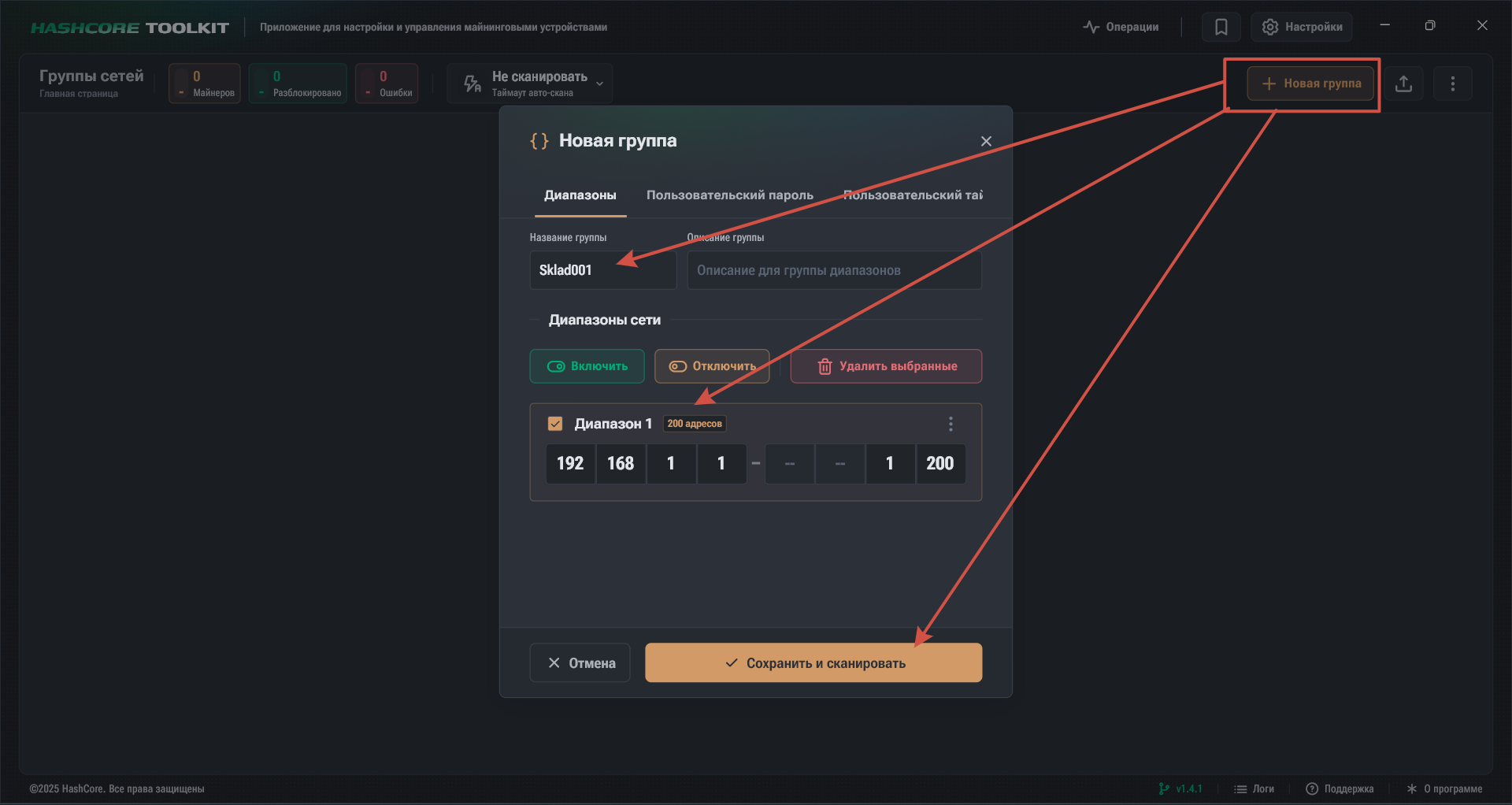 Заходим, жмем на "Новая группа" и задаем диапазон поиска устройств.